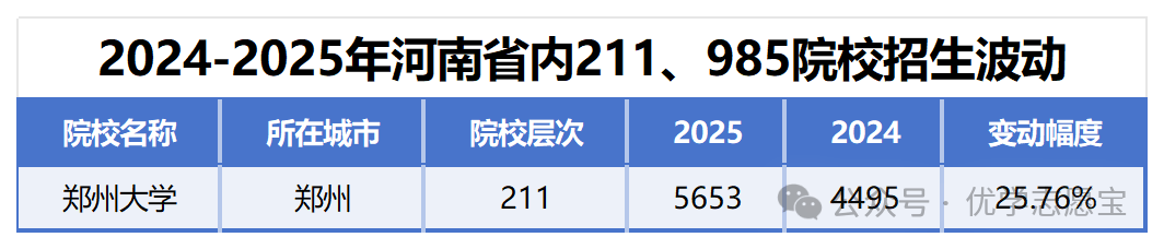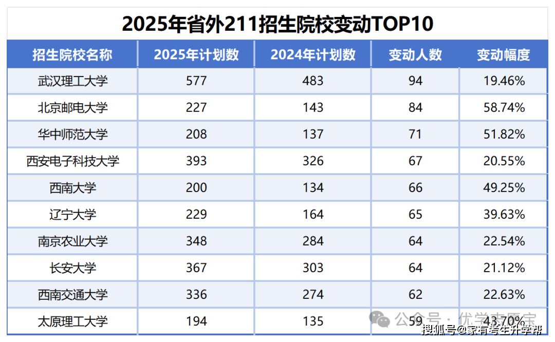 下表展现的是2025年面向河南招生的211院校的招生打算数变更TOP10高校,这里的211统计不包含985高校,能够看出变化幅度要比985院校大。添加最多的院校前三名别离为武汉理工大学(添加94个打算)、邮电大学(添加84个打算)和华中师范大学(添加71个打算)。这些院校的招生打算添加数量还常客不雅的,让考生有更多选择机遇。变更幅度前三名别离是邮电大学、华中师范大学、西南大学,增幅别离为58。74%、51。82%、49。25%。增幅跨越40%的还有太道理工大学,增幅为43。70%。变更前十的省外211院校里均为增加,总体211院校的招生人数呈增加趋向,这对成就优良的考生来说是一大利好,考生能够上更高条理的院校。