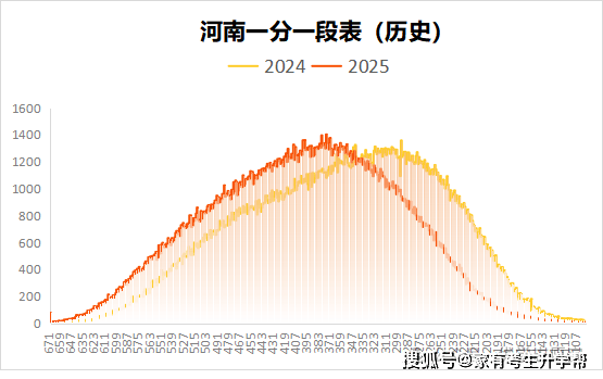 上图是河南省物理类2024和2025年的一分一段表同分人数对比阐发图,从图中能够看出,同分人数分布趋向大致不异,取2024年比拟,2025波峰前移,正在部门分数段人数分布稍微有点差距。从分布图趋向能够看出,2024年700分以上有52人,2025年700分以上增加至108人,这申明绝对高分的考生合作压力变大。峰值是分布的人数比力集中的区域,从图中能够看出,2024年同分人数峰值分数区间正在517-385分摆布,而2025年563-433分数区域同分人数达到颠峰,申明2025年中高分段人数添加,是位于波峰区间的考生合作压力增大,考生上更高条理的院校难度添加。优学教育教育院提示列位考生,填报的时候必然要留意高考人数、招生打算、位次的变更等,留够保底的院校,放置好填报梯度,以防滑档,同时,专业也要放置好梯度,以防被调剂。别的,420分当前,取2024年比拟,2025年同分人数分布是削减的,申明低分段的人数正在削减。