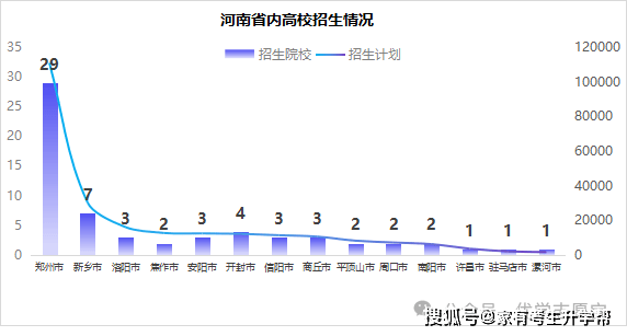 上表为河南省内各市高校招生打算数,郑州市因其院校数量最多使其招生打算遥遥领先,其做为省会城市,正在高档教育资本方面拥有显著劣势,有29所院校,110269个招生打算,占省内打算的44。94%,几乎占领半壁山河。紧随其后的是新乡市7所院校30221个招生打算,占省内打算的12。32%;洛阳市3所院校16022招生打算,占省内打算的6。53%。除上述市外,招生打算过万的还有焦做市(2所院校12714个打算)、安阳市(3所院校12488个打算)、开封市(4所院校12258个打算)、信阳市(3所院校11437个打算)和商丘市(3所院校10650个打算)。这些市的高校都正在省内高档教育中的主要脚色。