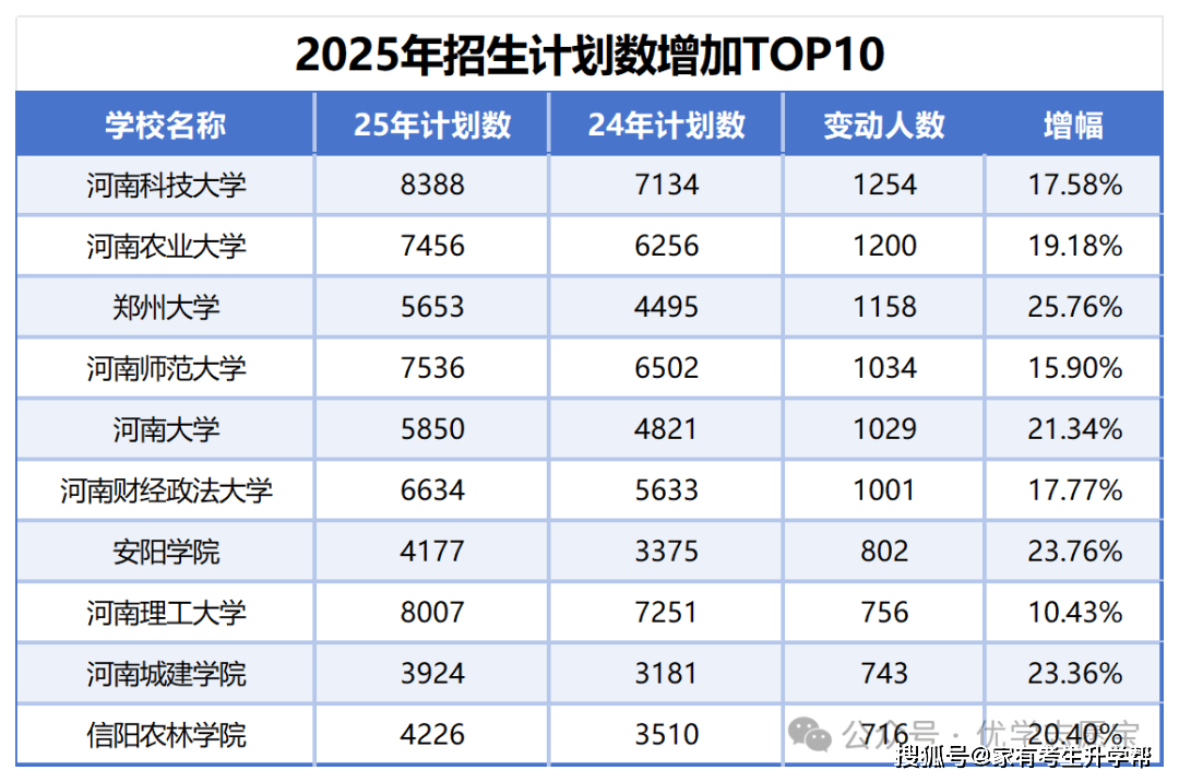 下表为河南省内招生打算添加top10院校。打算数添加前三名别离为河南科技大学、河南农业大学和郑州大学,添加打算数别离为1254、1200和1158,申明这些学校正在教育资本和容量上的显著扩展。增幅前三名别离为郑州大学、安阳学院和河南城建学院,别离为25。76%、23。76%和23。36%,申明这些学校省内招生志愿强烈。排名前十的扩招院校均为河南省内院校,且增幅均跨越10%,这也申明省内院校对考生起到了积极的支持感化,同时也申明有更多的考生能够上这些院校的机遇。
