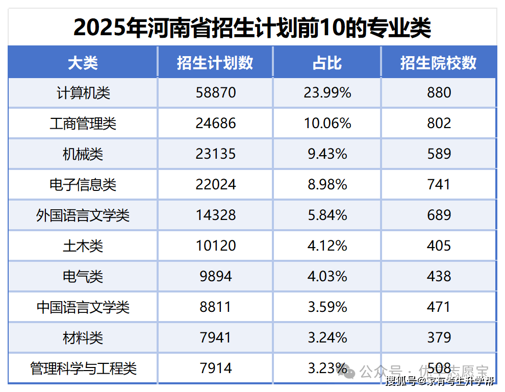 下表为河南招生打算前10的专业类,能够看出,工学学科门类占领半壁山河,十席中占五席,脚以申明国度和各高校对工科的注沉,当然,这也和工学大类下专业数量最多相关,良多耳熟能详的专业都属于工学学科门类,好比计较机,从动化,机械制制及其从动化、软件工程、电子消息等。打算数第一名专业类是计较机类,有880所学校招收此类专业,占领合计划数的23。99%。得益于互联网大潮以及各行各业都需要计较机专业人才,此类专业备受考生、家长和企业欢送。除了“计较机科学取手艺”专业这个备受逃捧的专业外,收集工程、软件工程、消息平安等专业也属于该类。打算数第二名专业类是工商办理类,有802所院校招收此类专业,占合计划数的10。06%。大师所熟知的财会类专业就属于此类专业,除此以外,市场营销、人力资本办理等也属于此类专业。因其文理兼收的特点,工商办理类专业是良多文科生的首选专业类。打算数第三名专业类是机械类,有589所院校招收此类专业,占合计划数的9。43%。机械类专业人才是每个制制业企业必需的,此类专业包含机械制制及其从动化、机械工程、车辆工程等专业。除了计较机类和机械类外,还有的三个工学门类专业是电子消息类、土木类和电气类。电子消息类和电气类也是近几年爆火的专业,由于电子消息就业面较广、就业条理相对较高,电气类专业则是国度电网所青睐的专业。当下房地产行业处于下行趋向,这也导致已经红极一时的土木类专业遭到萧瑟。除上述专业类外,外国言语文学类和中国言语文学类均属于文学,很较着的偏文类专业。外国言语文学类专业包含英语、德语、法语等外语专业,英语专业因其普及性,是良多大学都招收的专业,但其就业环境近几年不如人意。中国言语文学类中的汉言语文学较受欢送的专业,也是文科生可选的大抢手专业之一,将来能够处置语文教员、编纂、记者等工做,可报考公事员的岗亭也良多。材料类专业之前是属于天坑专业之一,但跟着新能源汽车和芯片的成长,特别正在新能源、半导体等高端范畴需求激增,就业前景反而全体向好,招生打算也添加了不少。办理科学取工程类是办理学中偏理的专业类,办理科学取工程类消息办理取消息系统、大数据系统取使用、工程制价等专业比力受欢送,同时也需要学生有较好的数理学问和逻辑思维能力。
