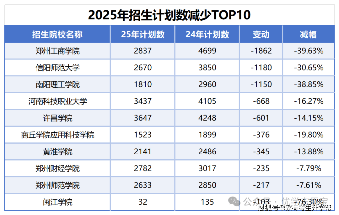 下表为河南省内招生打算削减top10院校。打算数削减前三名为郑州工商学院、信阳师范大学和南阳理工学院,削减额别离为1862、1180和1150,也是仅有的三所缩减打算人数过千的院校。打算数减幅前三名为闽江学院、郑州工商学院和南阳理工学院,减幅别离为76。30%、39。63%和38。85%。此外,前十名高校里跨越30%的还有信阳师范大学,减幅为30。65%。