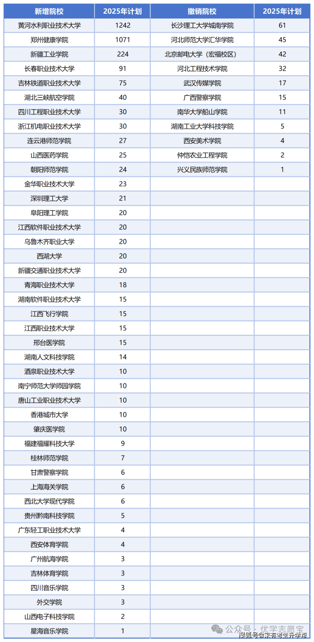 按照河南省教育发布的数据,2025年河南省高校招生打算总人数为物理组87,4371人、汗青组20,3196人,合计107,7567人。本科招生打算为37,0770人,较2024年添加15988人,增幅4。51%。此中汗青类大幅缩减10732人,降幅13。34%,打算数降至69703人;物理类显著添加26720人,增幅9。74%,打算数冲破30万至301067人。据数据统计阐发,2025年河南新增43所招生高校,按照新增打算从高往低进行排序,汇总如下。此中,新增院校中招生最多的是黄河水利职业手艺大学,该校由黄河水利职业手艺学院升格而来,2025年招生打算为1242人;其次是郑州健康学院,是由郑州澍青医学高档专科学校升格而来,2025年新增招生打算为1071人,这两所职业本科院校。第三名是新疆工业学院,新增招生打算为224人。新增院校2025年招生合计划为3227人,这43所院校多为外省的院校,但第一、二名两所省内院校招生人数共计2313人,占了新增总数的71。7%。2025年河南省撤销院校中,客岁招生打算最多的是长沙理工大学城南学院61人,其次是师范大学汇华学院45人,撤销院校2024年招生合计划为235人。