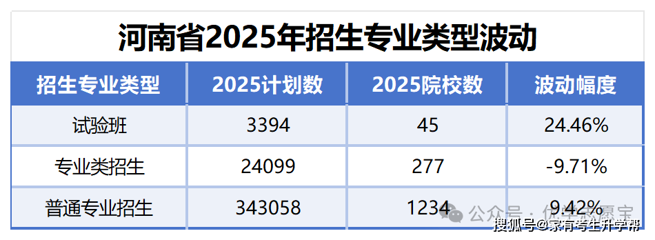 从2010年起,国内不少高校纷纷推出新设的试(实)验班(学院),方针曲指培育立异拔尖人才。良多高校设有多个试验班,按照试验班的专业性质及培育模式。一些高校的试验班以人名定名,如工程大学陈赓尝试班、浙江大学竺可桢学院等。还有一些高校以“科类+试验班”的形式定名,如科技大学的理科试验班、复旦大学的经济办理试验班等。2025年河南省按试验班招生的院校共45所,招生打算共计3394人,比拟于2024年上升了24。46%。呈现此种缘由是由于一些大学的试验班专业设置不如人意,如将土木、材料等组合成工科试验班。这些专业可能是按照社会成长科学的需要和将来成长预测而设置的,但考生首要考虑的是结业后可否顿时就业,这就导致专业的设置取现实需求不符,成为被摒弃的缘由之一。进而导致该类试验班收分不高,学校因而调整招生打算。专业大类招生是以统一学科和附近学科专业通识教育为根本的一种人才培育模式,近年来被越来越多的高校所采用,代表着将来招生登科以及高校人才培育的主要标的目的。可是有些大类包含的专业会有一些圈套,有些高校会把抢手取冷门专业放正在一路招生,填报的时候要隆重。目前,不少“双一流”高校已实行按大类招生的模式,一些一般本科院校也起头实行。凡是,大类招生的高校正在发布招生打算时,大多以“类”定名各专业,好比经济学类、机械类、中国言语文学类、计较机类等。2025年河南省按专业类招生的院校共277所,招生打算数共计24099人,相较于2024年下降了9。71%。填报专业类的学生进校后按院(系)同一办理,一般正在大二下学期按学科大类培育之后,由学生按照本人志愿、专业乐趣、以及社会需乞降自从择业的现实环境,选择具体专业标的目的再攻读二至三年结业。专业招生,就是分专业招生。投档后被登科到一个具体、固定的专业,进入大学后按照该专业培育方案培育。比拟于试验班、专业类招生,通俗专业招生可以或许避免专业分定之前的内卷、绩点、排名的焦炙、不安情感。2025年河南省通俗专业招生打算数为343058个,共1234所院校采用通俗专业招生的体例进行招生,相较于2024打算数上涨9。42%。