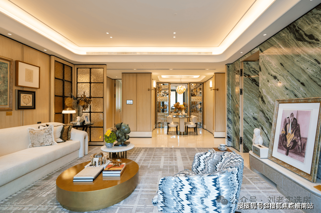 此外,相较于常规顶豪中奢石的简单铺贴,绿城黄浦ONE沉视石材的艺术化设想——通细致心设想的拼花设想取参差有致的制型组合,付与石材墙面艺术表示力;室内墙面更是采用难度较高的四段式工艺,每层材质的跟尾取工序跟尾均要求极高精度,不只施工难度大,材料损耗也显著高于常规做法!